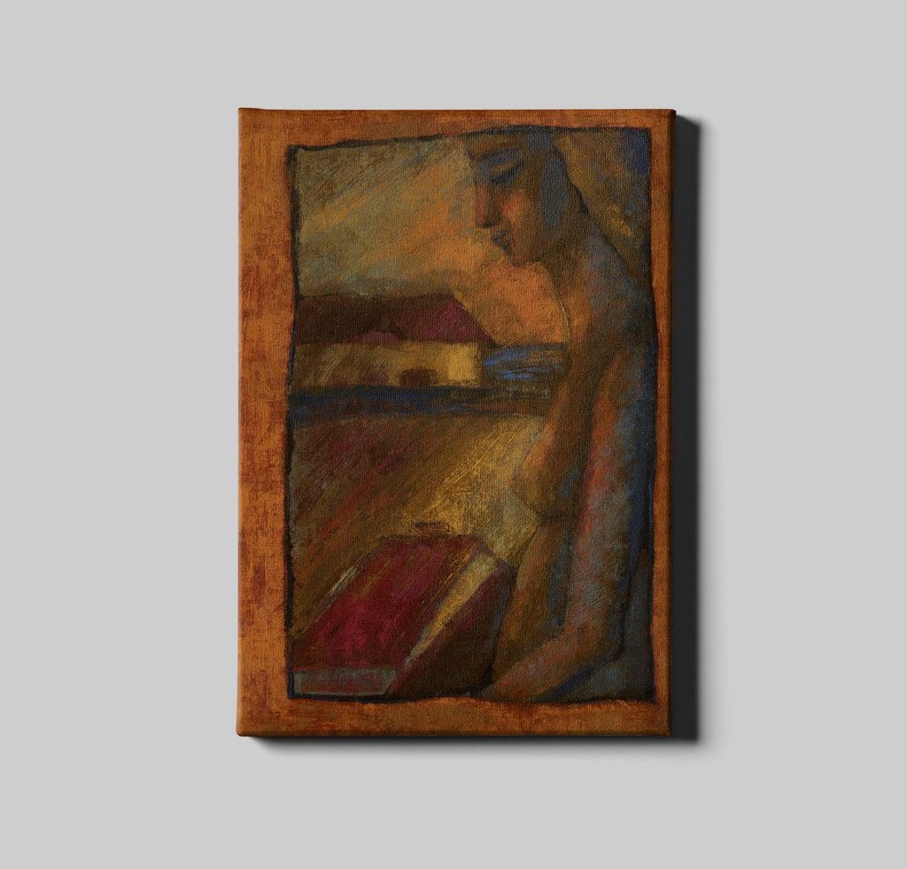 Les tableaux de Djina Chemtov sont empreints d’une beauté étrange, profondément poétique. Ils sont centrés sur le regard, le regard d’une femme avec un visage effilé, avec de grands yeux noirs en amande, pensifs, évocateurs de souvenirs, porteurs d’une mémoire séculaire, avec la tête légèrement penchée sur l’épaule comme dans une position d’attente, de prière, de contemplation.